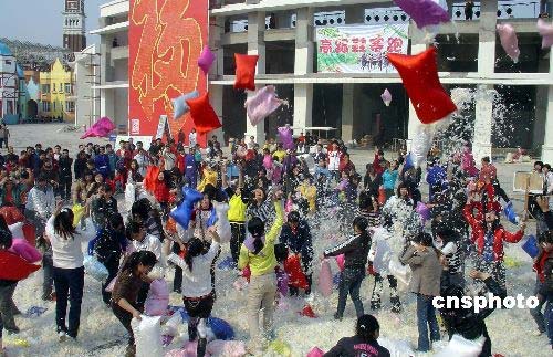 為慶祝即將到來的“三八”國際婦女節,風靡歐美的游戲“枕頭大戰”3月3日在長沙世界之窗再次擂響戰鼓,千余名女性以枕頭當“武器”,互相投擲,發泄壓力。中新社發 肖前輝 攝