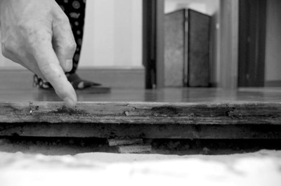 “距我們反映主衛門框下面滲水、造成主臥的地板部分褪色、門框底框腐爛、門套底部貼面有氣泡突起、地磚大面積發黃這些問題已經一個月了。有人來看過也說是‘防水沒做好’,但沒單位負起這個責,徹底解決這件事,只是互相推諉。作為弱勢群體的我們只能不停地反映、等待,F在被挖開的地方,每天都會有小蟲爬出來。哎,花600多萬買的房子,浴缸卻只能看不能用。 ”陳老先生的老伴邊說邊指著旁邊畚箕里她掃出來的黑色小蟲子。對此,物業部門也派人檢查了好幾次。