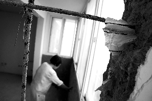 瑞旗家園兩業(yè)主裝修時,發(fā)現(xiàn)兩家陽臺之間的墻壁酥脆,碎墻塊用手一捏便成散沙狀(本報昨日報道)。昨日上午,昌平區(qū)建委兩名工作人員,與開發(fā)商工作人員到業(yè)主徐先生家中鑒定酥脆墻壁,建委人員對著陽臺墻壁踢了幾下,墻上的土便“嘩嘩”往下掉,該人員邊踢邊說,“這樣不行,不過關。”另一建委工作人員搖了搖露出的鋼筋,發(fā)現(xiàn)鋼筋與主體墻壁和天花板都沒勾連上,證實存在質(zhì)量問題。