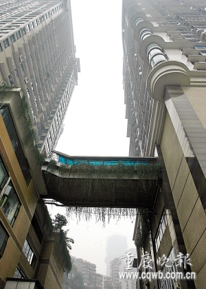 嘉園有業主500余戶,錦園有業主600余戶。當初,開發商特意在兩樓之間設計了一座天橋,目的是讓兩個小區的空中花園、健身器材等可以共享,更重要的是方便兩個小區業主出入——錦園的業主可以經嘉園直達臨江門、解放碑,嘉園業主也可經錦園到一號橋。