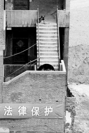 郭長喜說,自己家本來養的有一條狗,但看到周圍鄰居拆遷遇到的問題,就花錢買了兩條牧羊犬。從此,三只狗天天為這個家站崗放哨。記者采訪過程中,一只牧羊犬一直臥在露天樓梯上,目光炯炯的望著四周。