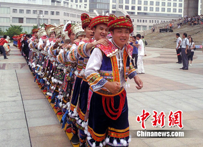 今天,由中國工藝織錦大師譚湘光和8名“織女”經過96天織就的世界最大壯錦,在“廣西活動周”開幕式上贈獻給上海世博會,壯錦長6.2米,寬3.6米。同時,“世界最長板鞋”亦亮相“廣西活動周”,該板鞋共23節,每節2.2米,總長為50.6米,由115位身穿少數民族盛裝的青年男女腳踏板鞋喊著號子向前行走。(完)