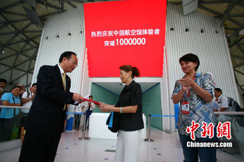 中新網(wǎng)上海8月10日電(記者 陳婷婷)10日,上海世博會中國航空館參觀體驗總?cè)藬?shù)突破百萬大關(guān)。來自上海寶山區(qū)的陳惠珉女士成為第100萬名幸運體驗者。世博局浦西DE片區(qū)部陳超部長親臨現(xiàn)場向中國航空館迎來第100萬體驗者表示祝賀。中國航空館館長周俊向陳惠珉女士贈送了“中國航空館第100萬幸運體驗者”榮譽證書,以及豐厚且具有航空特色的獎品。