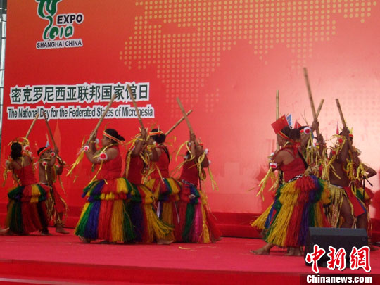 中新社上海8月29日電 (記者 鄭瑩瑩)以熱帶風情著稱的太平洋島國密克羅尼西亞29日迎來國家館日。在官方儀式上,數十名島國舞者穿著及踝草裙,手持竹竿相互敲打,以原生態歌舞展現島國熱情奔放的民俗風情。