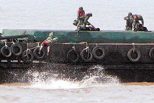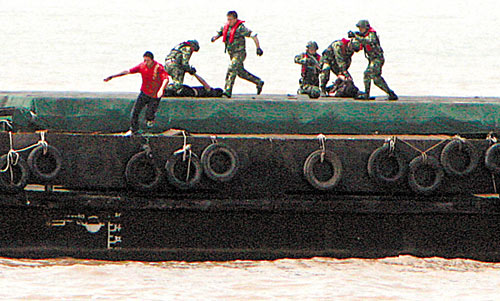 “跳幫!”一聲令下,10余名海警官兵利用兩船靠近和波浪起伏間隙最小的瞬間,飛身魚躍,紛紛越過船艇護欄,跳到貨輪上。海警擊斃一名“恐怖分子”,制伏兩人,另一名“恐怖分子”慌不擇路跳海,也被飛身入海的海警抓獲。此時藏匿在機艙的4名“恐怖分子”瞅準空隙,駕艇逃竄。