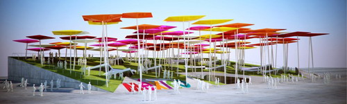 風箏廣場是墨西哥館的核心。風箏在nahuatl語(民族方言)的名稱是“papalotl”,也就是西班牙語中的蝴蝶。風箏是連接墨西哥文化和中國文化的一個要素。參觀者可以在墨西哥館里購買風箏,或者親手做一個風箏,然后在風箏廣場上放飛。由風箏組成的森林代表著墨西哥人對未來的期待,廣場上的人造綠草表達了墨西哥人對城市綠地的關(guān)注。人們可以在綠地上進行各種活動,諸如讀書、野餐或是在陰涼處隨意地休憩;綠地上空,風箏在飛翔。