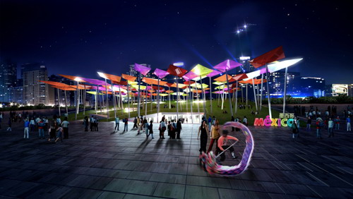 墨西哥館占地面積4000平方米,將展示墨西哥的歷史、文化和夢想。據(jù)墨西哥館相關(guān)負責人介紹,進入墨西哥館,參觀者就好似開始了一段從史前時代到未來的墨西哥歷史旅程。展覽的第一部分為“回顧過去”,投影到地板上的三個屏幕將分別反映墨西哥史前城市、殖民地城市和19世紀城市的風貌;第二部分為“了解現(xiàn)狀”,空間中充滿了不斷運動和投映的元素,代表著城市的現(xiàn)實動態(tài)。在這里,就好像站在現(xiàn)實的窗口前,參觀者能夠看到墨西哥的現(xiàn)狀;第三部分則為“展望未來”,主辦方為參觀者提供了一些互動表格,其中列出了一些信息,用于交流與創(chuàng)設更好的墨西哥發(fā)展計劃、未來項目以及可持續(xù)環(huán)境計劃。在整個旅程的終點,參觀者將通過一個有三個屏幕的狹小空間,看到位于展廳頂部的風箏廣場的實時圖像,圖像將顯示正在廣場進行的活動,隨后參觀者會被邀請登上廣場,成為廣場活動的一部分。