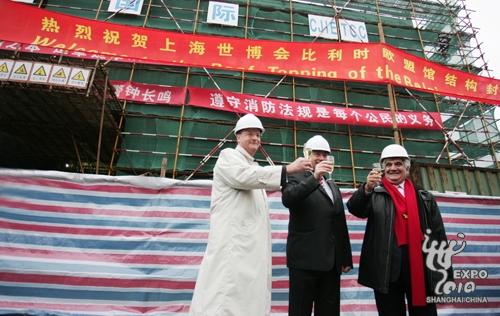 自破土動工之日起僅三個月時間,位于上海世博園區C片區的比利時—歐盟館便宣告結構封頂。昨天下午,比利時—歐盟館舉行結構封頂儀式,歐盟駐華大使、上海世博會歐盟館總代表賽日安博和上海世博會比利時展館總代表戴明哲與來自歐盟和比利時的官員,一起見證了展館建設進程中這一具有里程碑意義的時刻,安博也首次介紹了歐盟展區的展示方案。