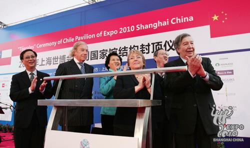 智利上海世博會總代表宋維和、智利駐華大使費爾南多•雷耶斯•馬塔、上海世博局副局長黃健之、中國外交部拉美司副司長李寶榮、上海市外事辦公室副主任吳金蘭等出席了封頂儀式。中智兩國官員共同將聞名全球的智利紅酒注入一個冰雕的智利國家館標志中,圓球內的智利紅酒緩緩形成一條紅色的紐帶,連接起位于地球兩端的中國和智利,象征著兩國之間的親密友誼。