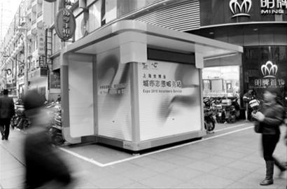 記者所見的這個(gè)“七彩之心”站亭,屬于外建站,地處徐匯區(qū)商業(yè)街“永新坊”,不過7平方米,主要材料為耐高溫、耐潮濕、耐風(fēng)雨的彩鋼板。外形四四方方,看上去,與東方書報(bào)亭差不多大小,主色調(diào)為白色,四周邊沿則以七色裝飾,如彩帶縈繞。正面卷簾門板上,印著志愿者標(biāo)志——七彩的志愿者之“心”,“上海世博會(huì)城市志愿服務(wù)站”幾個(gè)大字十分醒目。左、右兩側(cè)的門板上,同樣繪有世博會(huì)標(biāo)志和志愿者標(biāo)志,以及世博會(huì)志愿者口號:“世界在你眼前,我們在你身邊”。在站亭的正上方,有一條LED滾動(dòng)顯示屏,滾動(dòng)著“城市,讓生活更美好”等宣傳標(biāo)語。