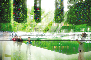 “建筑內部的綠色立體園林,也使用了可降解、可循環的材料,以盡可能達到最大限度的環保。這些綠色的植物,除了可以讓人們親近自然,還能夠幫助調節室內溫度,讓參觀者更加舒適。屋頂的太陽能電池板,則提供了清潔而免費的能源。”方可說。