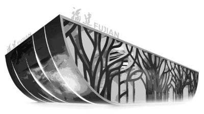 福建地處祖國東南沿海,面向臺灣海峽,依山傍海,擁有豐富的生態資源和漫長的海岸線。因此,福建館整體外觀設計為船形,以“綠、藍、白”為主色調,正面為綠色榕樹造型,兩側船頭為藍色大海影像墻,頂部為白色橫梁,充分體現福建山中有城、城中有山,城海相連、海城一色的景象。整個展館像一艘在臺灣海峽中乘風破浪的“生態船”,展現了福建作為綠色大省的風采。