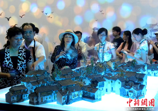 整個(gè)案例詮釋了周莊在古鎮(zhèn)保護(hù)、環(huán)境建設(shè)和開發(fā)利用方面的成就,通過視頻演示、活態(tài)表演、水幕浮雕、論壇等多種形式,生動(dòng)多角度展現(xiàn)“小橋流水人家”的江南獨(dú)有風(fēng)韻和美好生活。在約五百平方米的案例展區(qū)內(nèi),分為“中國(guó)第一水鄉(xiāng)”、“我愛周莊”、“周莊是國(guó)寶”三個(gè)篇章。步入展區(qū),就猶如身處一幅緩緩打開的畫卷中:眼前波光流翠、粉墻黛瓦、翠竹搖曳、庭院疊嶂,阿婆茶、手編竹、繡花鞋等手工藝表演盡顯婉約吳地人文風(fēng)情;踏入長(zhǎng)廊,煙波浩渺盡收眼底;穿過拱門,臨坐美人靠,古園風(fēng)情、江南田園風(fēng)光旖旎;古戲臺(tái)上昆曲表演,水袖飄逸賞目、天籟之音悅耳;虛實(shí)結(jié)合的名景雙橋,頭戴斗笠、身著水鄉(xiāng)服飾的江南女子,一切美不勝收。