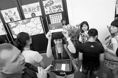 昨天下午2點, 18名在斯洛伐克館等待入場的美女被邀請參加“女士之日”的選美大賽,比賽共分為兩個環節,包括有關世博和斯洛伐克的問答,以及才藝表演。在決賽環節,三位女士同時學唱一首斯洛伐克兒歌,現場的觀眾則成為決賽評委。最終,來自上海徐匯區的護士小姐沈瑾脫穎而出,獲得 “斯洛伐克館小姐”的榮譽稱號,她的大幅照片還將被掛在斯洛伐克館的貴賓廳。除了來自斯洛伐克館的眾多禮遇,她還能選擇多個熱門場館,直接從VIP通道入內參觀。