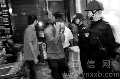 “緊急通知,今晚九點(diǎn)半在分局集中,參加統(tǒng)一行動(dòng)。”晚21時(shí)左右,官渡公安分局治安大隊(duì)民警們突然接到了臨時(shí)通知。22時(shí),內(nèi)線發(fā)出信號(hào),警車(chē)開(kāi)往珥季路某娛樂(lè)會(huì)所。當(dāng)50多名全副武裝的警察沖進(jìn)該娛樂(lè)場(chǎng)所時(shí),訓(xùn)練有素的迎賓們并沒(méi)有慌亂,漂亮的姑娘們依舊招牌式笑著:“歡迎光臨”。