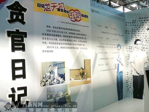 展廳中引人矚目的,是曾“名噪一時”的自治區煙草專賣局原銷售處處長、來賓市煙草專賣局原局長韓峰!叭沼浘珠L”也進入展覽,引來眾人圍觀。