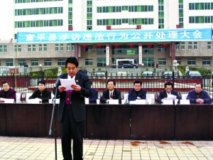 回應:記者在富平縣法院網看到該網站刊載了一張公開處理大會的照片,3月5日當天,站在富平縣政府廣場上念稿子的官員正是該縣法院副院長奧繪。背后列席的官員中,該縣政法委及法院的主要領導都在。