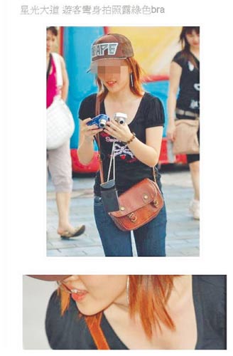 媒體報道一個新網(wǎng)志最近兩月刊載大量女游客及女學生走光照,相片疑主要攝自旅游點如星光大道、尖東海濱長廊、尖沙嘴文化中心及海洋公園,有立法會議員、大律師及導游均譴責網(wǎng)志嚴重侵犯私隱,兼影響香港旅游聲譽,促請警方加強執(zhí)法打擊偷拍者及刊載網(wǎng)站。