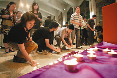 出席追思會的校友及市民點起燭光,悼念梁錦榮。圖片來源:文匯報