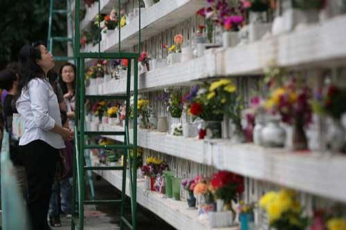 中新網10月17日電 據香港大公報報道,秋高氣爽,香港大批孝子賢孫在重陽節前往拜祭先人。不僅將軍澳和鉆石山等墳場,連紅磡一帶的長生店,也有市民手持大包小包祭品,到先人骨灰龕位前拜祭,慎終追遠。有市民到和合石景仰園,向馬尼拉人質事件中罹難的其中四名港人致祭。