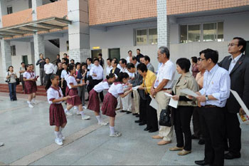 在白塔中學(xué),學(xué)生透過(guò)唱歌和跳舞歡迎議員到訪,并向香港市民送上感謝。其后,同學(xué)們又向來(lái)自香港的客人致送感恩卡。該校校長(zhǎng)何平向議員簡(jiǎn)介說(shuō),重建后該校將可提供2200個(gè)學(xué)位,較原有的學(xué)位增加超過(guò)30%,議員最后更與學(xué)生高唱一曲“感恩的心”。