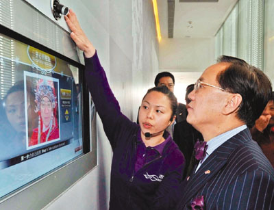為推介香港館,煲呔(曾蔭權(quán))不惜“粉墨登場”扮演粵劇大老倌?非也,原來香港館在入口處歡迎參觀者的是一個計算機造型游戲,曾蔭權(quán)親身上陣,一試游戲:“毋須粉墨也能裝一下大老倌,然后把趣怪扮相電郵給朋友。”