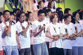 嫁給臺灣富商鄭翔中后,移居當地13年的前港姐李美鳳,不單捐出一對子女的利是錢,更即場除下手上的價值10多萬的鉆石表義賣。愛心是無價的,所以她不設底價。鄭秀文與劉德華合唱《喝彩》,她說:“天災無法避免,人類好渺小,要正面態度去面對,要帶著勇氣活下去,黑暗過后一定有陽光!”還有藝人狄波拉、陳奕迅、方力申、劉璇等,也充當接線生出力籌款。