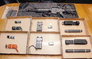 中新網5月28日電 香港警方27日在香港將軍澳一公屋單位搗破武器庫。據香港《文匯報》報道,一對無業李姓兄弟涉嫌藏有包括2支電槍、2支伸縮警棍及仿制長氣槍等攻擊性武器,當日清晨于睡夢中被接獲情報的警員趕到入屋拘捕,嫌犯母親也被拘捕一并帶回警署協助調查。