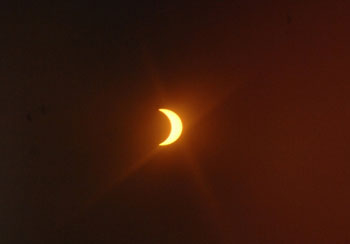 最大食分在約9時15分出現,四分之三的太陽被陰影遮蓋,濾光片下的太陽仿如一彎新月。但天色并沒有出現昏暗,因為要太陽被遮近九成半,才會出現天氣突然變暗的現象。