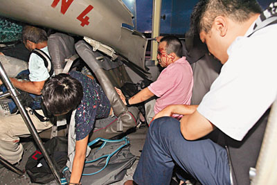 由于沖擊力度猛烈,意外后小巴車頭陷入堅硬貨柜尾,司機(jī)首當(dāng)其沖奄奄一息;車廂內(nèi)多排座椅椅腳斷開,座位向前傾倒,部分乘客如“三明治”般人疊人受困,其余乘客則被拋離座位撞傷。同時,車頭引擎開始冒出火舌及濃煙,全車人危在旦夕。
