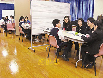 中新網(wǎng)1月14日電 升中學(xué)面試對香港小學(xué)生而言,有著舉足輕重的影響,故有小學(xué)日前舉行大型模擬面試,約50名高小學(xué)生家長搖身變成威嚴十足的面試官,以流利的兩文三語考核學(xué)生,協(xié)助近170名小六生預(yù)演氣氛緊張的升中面試。有學(xué)生早在1周前已認真準備,把握練習(xí)機會,全力爭取入讀心儀英文中學(xué)的機會。