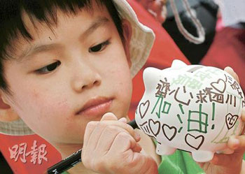 海港城舉行籌款活動,讓孩童在白瓷“熊貓錢罐”上繪畫,對四川災民送上祝愿。(圖片來源:明報)