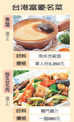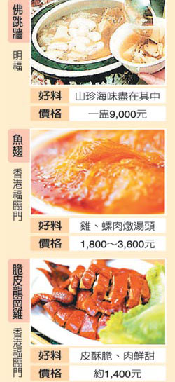其中福臨門就是眾所公認的富豪飯?zhí)茫嗥るu、燕窩、魚翅與荷葉糯米飯,在質量與口碑上都是一等一,價格也成正比,以套餐為例,一客魚翅、25頭吉品鮑、龍蝦、乳鴿、炒飯加燕窩要港幣2500元。此外鮑魚大王楊貫一的富臨飯店、四季酒店中米其林三星的龍景軒也都算得上是富豪飯?zhí)谩?/p>