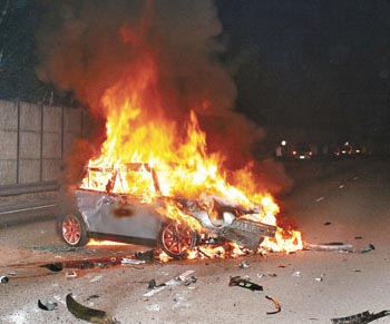 司機陳某被懷疑沒有扣好安全帶而導(dǎo)致其彈出車外,重傷昏迷倒臥在跑車對開三公尺處,車頭隨即冒煙起火,全車迅即陷入火海。其它駕駛者路過看見這一幕停車察看,但害怕跑車發(fā)生爆炸,報了警卻不敢走近,各人焦慮地圍觀,等待救援人員到場。