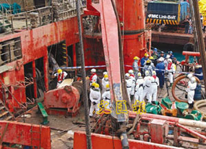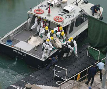 沉沒36天的烏克蘭補給船“Neftepaz-67”,日前被海上大力士“華天龍”號吊起后,搜索行動隨即展開。警方災難遇害者辨認小組近百成員,戴上防毒膠袍及口罩,配備手提電腦及大批搜索工具,聚集大欖水警基地,由多艘小艇送往大小磨刀洲現場,由28日凌晨搜索至28日晚上9時。