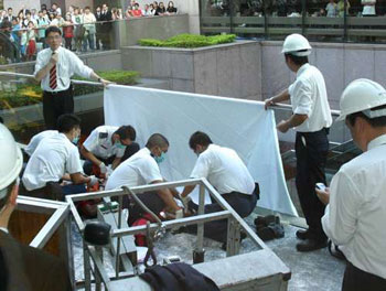 中新網8月14日電 據香港大公報報道,香港中環國際金融中心一期商場,13日發生罕見垮塌吊船意外。一名外籍工人擬乘鐵斗式吊船清潔玻璃幕墻時,吊船突自3樓跌下1樓平臺,途中擊碎兩塊巨型強化玻璃檐篷,事主頭部重傷昏迷。四名在露天茶座聊天的男女被“玻璃雨”碎片擊中輕傷。