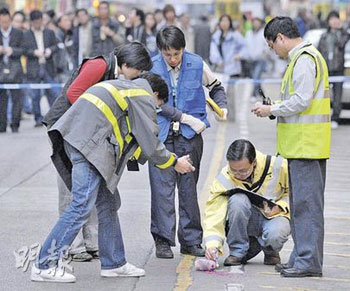 近30名探員聯(lián)同特區(qū)政府化驗(yàn)師,16日下午在懷疑第一現(xiàn)場(chǎng)的遠(yuǎn)景大廈,將4個(gè)盛有顏色液體的膠瓶在不同高度擲下街中,以量度膠瓶彈跳程度,尋找線索。警方已將案件列作“意圖造成身體嚴(yán)重傷害而淋潑腐蝕性液體”。