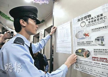 特區(qū)政府化驗(yàn)師首先從大廈13樓天臺(tái)兩度拋下裝有透明液體的膠瓶,發(fā)現(xiàn)膠瓶均落在大廈對(duì)面近行人路位置。化驗(yàn)師再拋下一個(gè)藍(lán)色液體膠瓶,落地位置一樣。及后眾人借用大廈6樓一單位,拋下一個(gè)紅色液體膠瓶,發(fā)現(xiàn)膠瓶落在馬路中心。每次拋擲膠瓶后,化驗(yàn)師都會(huì)將液體四濺位置仔細(xì)記下,再度尺計(jì)算膠瓶與大廈的距離。