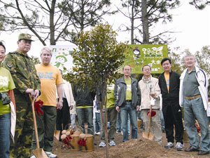 嘉賓與澳門學(xué)生首先卷袖揮鍬,栽下多株小樹,平整泥土,并親自為樹苗澆水。200多名官兵隨后與居民一起刨坑鏟土、提桶澆水,顯得非常高興和投入,經(jīng)過(guò)一個(gè)多小時(shí),逾千棵的小樹實(shí)時(shí)為空曠的山頭帶來(lái)無(wú)限的生機(jī),為山林再添一片新綠。