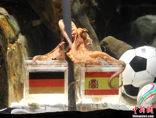 中新網(wǎng)7月9日電 據(jù)香港“星島日?qǐng)?bào)網(wǎng)”報(bào)道,南非世界杯期間,章魚“保羅”橫空出世,準(zhǔn)確預(yù)測(cè)了幾個(gè)場(chǎng)次的比賽,結(jié)果使它一躍成為家喻戶曉的“明星”。然而,西班牙首相薩帕特羅現(xiàn)在卻擔(dān)心起了這條章魚的安全問題。
