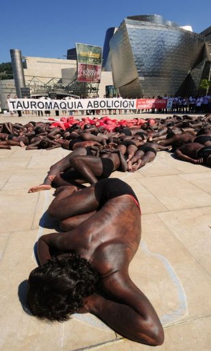 中新網8月23日電 據“中國時報”報道,大約100人上周末在西班牙北部城市比爾包的古根漢美術館外裸體抗議斗牛活動。