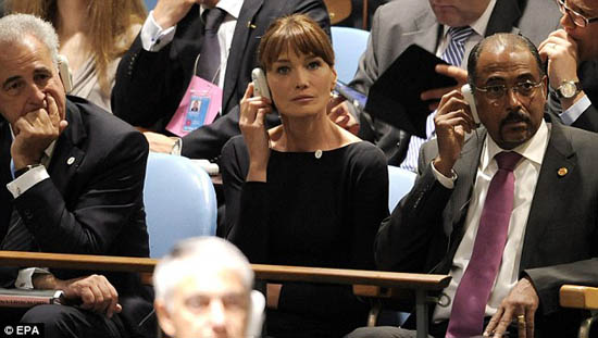 中新網9月21日電 據香港“星島日報網”報道,法國第一夫人布魯尼因為近期兩本新書的爭議性內容而成為傳媒焦點,她20日陪同總統丈夫薩科齊出席聯合國千禧發展目標峰會時,以一襲柯德莉夏萍裝亮相,實時吸引記者鏡頭。但最引人入勝的是,她在聆聽丈夫發言時,竟拿起傳譯耳機,難道她聽不懂丈夫的語言?