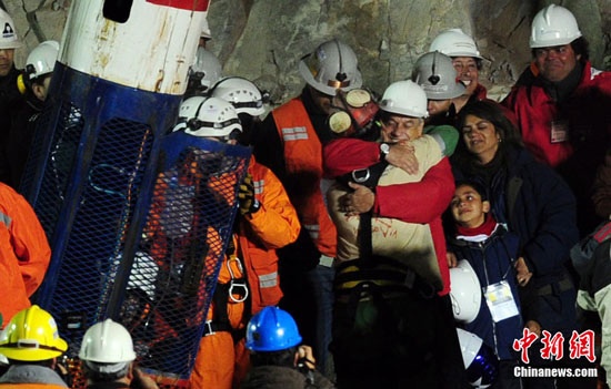 他脫險(xiǎn)后立刻與7歲兒子緊緊相擁,接著抱住妻子,然后是智利總統(tǒng)皮涅拉及其它工作人員。