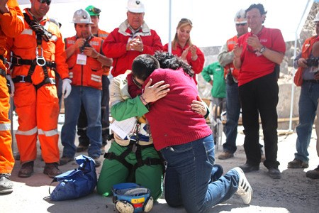 16日,智利科皮亞波,獲救礦工與親人擁抱。被困礦井2個多月的33名智利礦工奇跡獲救,他們在家鄉享受著英雄般的待遇。