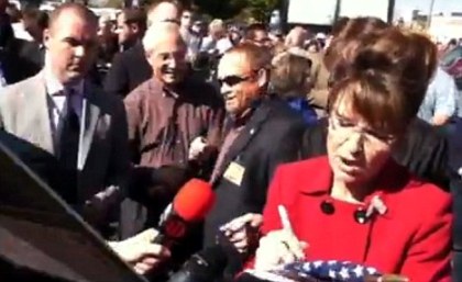 與此同時,奧巴馬中期選舉的競爭對手,共和黨人莎拉·佩林卻做了一件令美國人詬病的事。她沒有在“ipad”上簽名,而是選擇了在星條旗上簽上自己的大名。
