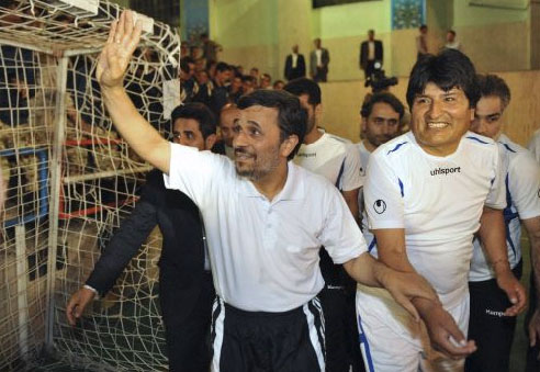 中新網10月29日電 據外電報道,伊朗總統穆罕默德·內賈德和玻利維亞總統莫拉萊斯長久以來因相似的政治立場和對美國的尖銳批評而為世界所矚目。現在,他們又站在同一陣營中,不過這一次是在五人制足球場上。