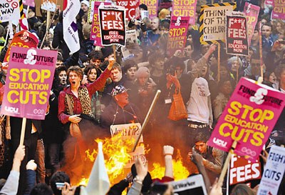 英國首相卡梅倫半年前上任時,曾許諾開辟“共識政治”的新紀(jì)元,但一場學(xué)生暴力示威標(biāo)志著英國聯(lián)盟政府“共識期”的結(jié)束。這也是20年來最暴力的街頭示威活動。據(jù)報道,部分示威者輕易突破警方防線,沖進6層高的總部大樓,擊破接待處的玻璃墻,肆意毀壞大堂家具,用噴漆寫上“保守黨廢物”等字句。有人直奔頂樓,從高處向地面人群擲下滅火器、水瓶等。