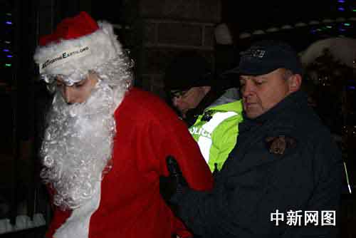 接著,話劇中的圣誕老人拿著裝滿煤炭的圣誕襪子,上前和警察談判,要求進去拜訪總理。為首的女警站在鐵欄桿里面,嘩啦一聲抽出手銬:“越過這條線,就逮捕你!”一個圣誕老人見毫無商量余地,趁警察有點分神,一個翻身越過1米多高的欄桿,但馬上被一擁而上的警察們摁在地上,手銬寒光一閃落在他的手上,并被押上附近的囚車。