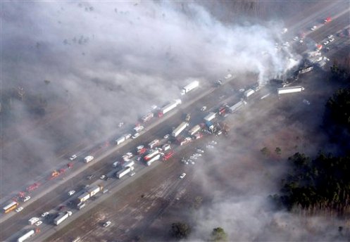 這起交通事故發(fā)生在佛羅里達州4號州際公路。在車禍發(fā)生之后,從坦帕到奧蘭多的一段大約15公里的路段已經(jīng)被封閉。早先拍到的事故全景照片顯示,大霧和濃煙覆蓋了該區(qū)域數(shù)十公里,清晨天空出現(xiàn)了奇怪的金黃色景觀。