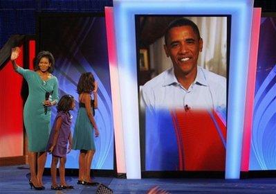 奧巴馬的兩個女兒莎夏和瑪麗亞在他們的母親演講完之后走上臺,大廳內揚起Stevie Wonder唱的《瞧她們多可愛》的歌聲。